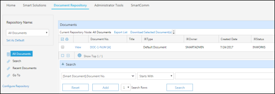 Documents are stored in the Document Repository. The document repository tree is displayed on the left side of the repository and contains the tree structure links for the selected Repository Name. The default repository is All Documents, but the default can be modified by selecting a repository from the drop down and clicking the Set As Default link.