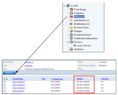 Deviations are attached to all of their affected documents automatically by using the change order and selecting the Deviation change type. Once attached, these documents will be linked together and can be seen in document view and under the References folder in the document record.